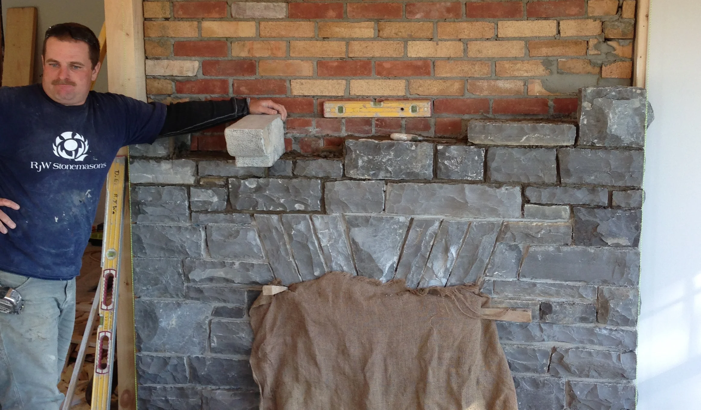This revitalized property on Loughborough Lake represents everything a cottage should be: It is a relaxing sanctuary for its busy owners, as well as an ideal place to gather with friends and family year round. When the 50 year old building was recently renovated, the owners decided to update the existing fireplace. The brick veneer was removed, and the fireplace was rebuilt with local rough-squared Limestone to suit the cottage's rustic setting. The reclaimed Hemlock barn beam is carried by two carved Limestone corbels, while the hearth is matching Limestone, cut in angled pieces to mirror the flat arch above the fireplace opening.